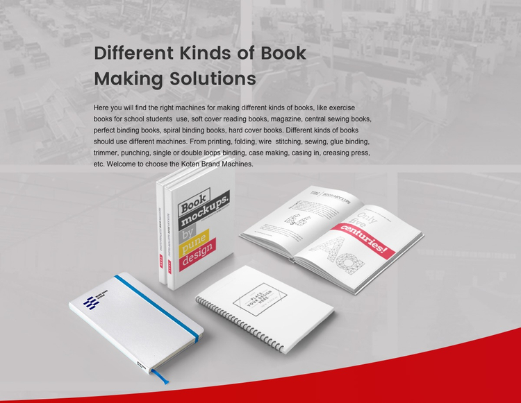 Chúng tôi cung cấp các loại sách khác nhau hoàn thiện các thiết bị ràng buộc, bao gồm các cuốn sách tập thể dục khâu dây cho học sinh trường học sử dụng, cả máy ràng buộc bán tự động và hoàn toàn tự động. Đối với các giải pháp tự động, bạn nên sử dụng máy in bù để in bìa sách, sau đó sử dụng